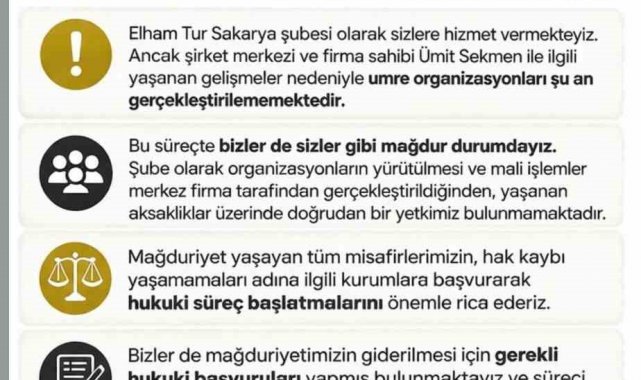 İstanbul merkezli hac ve umre hizmeti veren tur şirketinin Sakarya dışında Kocaeli ve Düzce illerinden anlaştığı umrecileri dolandırdığı öne sürülürken firma çalışanları 'Bizde mağduruz' diyerek yazı paylaştı. Paylaşılan yazıda, "Elham Tur Sakarya şubesi olarak sizlere hizmet vermekteyiz. Ancak şirket merkezi ve firma sahibi Ü.S. ile ilgili yaşanan gelişmeler sebebiyle umre organizasyonları şu an gerçekleştirilememektedir. Bu süreçte bizlerde sizler gibi mağdur durumdayız. Şube olarak organizasyonların yürütülmesi ve mali işlemler merkez firma tarafından gerçekleştirildiğinden, yaşanan aksaklıklar üzerine doğrudan bir yetkimiz bulunmamaktadır. Mağduriyet yaşayan tüm misafirlerimizin hak kaybı yaşamamaları adına ilgili kurumlara başvurarak hukuki süreç başlatmalarını önemle rica ederiz. Bizler de mağduriyetimizin giderilmesi için gerekli hukuki başvuruları yapmış bulunmaktayız ve süreci yakından takip etmekteyiz" denildi.
