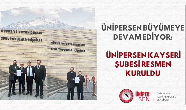 ÜNİPERSEN, yaklaşık 2 aydır yürütülen çalışmalar sonucunda Kayseri şubesi için gerekli yeter sayının tamamlandığını ve 11 Aralık 2025 tarihi itibarıyla ÜNİPERSEN Kayseri Şubesi'nin resmen kurulduğunu duyurdu. Sendikadan yapılan açıklamada, "Üniversite idari personelinin başını öne eğdirmeyeceğiz. Hangi ilde olursa olsun hakkın ve doğrunun yanında durmayı sürdüreceğiz. Hiçbir makamın gözüne bakmadan, hiçbir baskıdan çekinmeden eşit, adil ve çözüm odaklı bir sendikal anlayışı Kayseri'de de güçlü şekilde hayata geçireceğiz. Kayseri artık üniversite idari personelinin iradesini temsil eden kurumsal bir yapıya sahiptir. ÜNİPERSEN Kayseri Şubesi, bölgedeki tüm idari personelin beklentilerini duyuracak, sorunlarını görünür kılacak ve çözüm süreçlerinde etkin rol üstlenecektir. Sendikamız, çalıştıkça büyüyen, büyüdükçe daha güçlü adımlar atan bir yapıdır. Kayseri Şubemizin kuruluşu da bu kararlı yürüyüşün önemli bir basamağıdır. ÜNİPERSEN olarak Kayseri şubemizin tüm çalışma arkadaşlarımıza hayırlı olmasını diliyoruz. Bugün bir kez daha görülmüştür ki doğru yerde duranlar büyür, doğru sözü söyleyenler güçlenir, hakkı savunanlar asla kaybetmez" denildi.