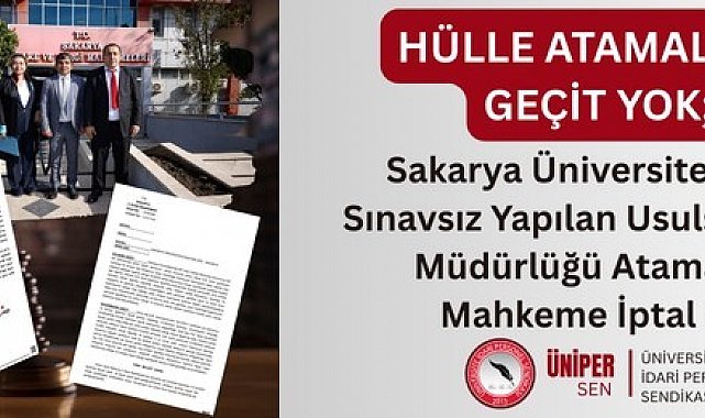 Üniversite İdari Personel Sendikası (ÜNİPERSEN), Sakarya Üniversitesi'nde yazılı ya da sözlü sınav yapılmadan gerçekleştirilen şube müdürlüğü atamasına ilişkin açtıkları dava sonucu atamanın iptal edildiğini açıkladı.