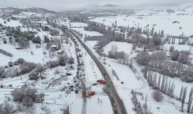 Yaklaşık 3 saat süren çalışmaların ardından yol yeniden trafiğe açılırken, Dumlupınar Rampaları'nda yolda kalan araçlar ve kilometrelerce oluşan trafik kuyruğu dron ile havadan görüntülendi.