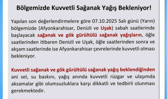 Uşak Valiliğince sosyal medya hesaplarından yapılan açıklamada, Afyonkarahisar, Denizli ve Uşak çevrelerinde etkili olması beklenen sağanak ve gök gürültülü sağanak yağışlara dikkat çekildi. Açıklamada, "Yapılan son değerlendirmelere göre 7 Ekim Salı günü sabah saatlerinden itibaren bölgemizde (Afyonkarahisar, Denizli ve Uşak) sağanak ve gök gürültülü sağanak yağışlar beklenmektedir. Öğle saatlerinden itibaren Denizli ve Uşak'ta, akşam saatlerinden sonra ise Afyonkarahisar çevrelerinde yağışların yer yer kuvvetli olacağı tahmin edilmektedir" denildi.