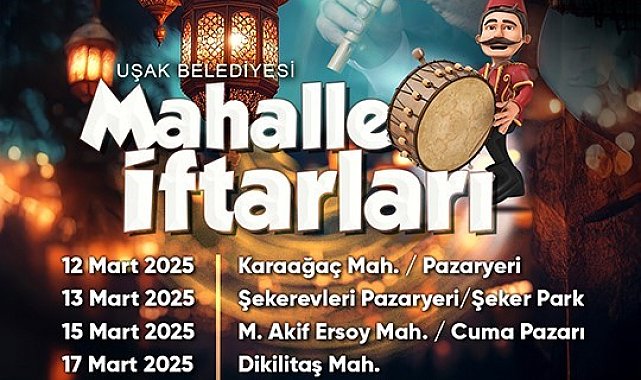 Uşak Belediyesi'nce düzenlenen Mahalle İftarları 12 Mart itibariyle Karaağaç Mahallesi'nde bulunan pazaryerinde başlıyor. Mahalle iftarları kapsamında 13 Mart günü Atatürk Mahallesi'nde bulunan Şekerevleri pazaryerinde, 15 Mart günü Mehmet Akif Ersoy Mahallesi'nde bulunan pazaryerinde, 17 Mart Dikilitaş Mahallesi'nde, 19 Mart Bölme Mahallesi meydanında ve 20 Mart günü ise İsmetpaşa Caddesi'nde yapılacak.