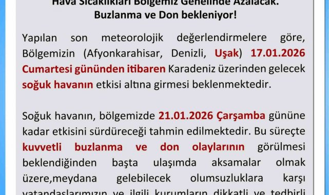 Uşak Valiliği, 17 Ocak Cumartesi gününden itibaren etkili olması beklenen soğuk hava nedeniyle buzlanma ve don olaylarına karşı uyarıda bulundu.
