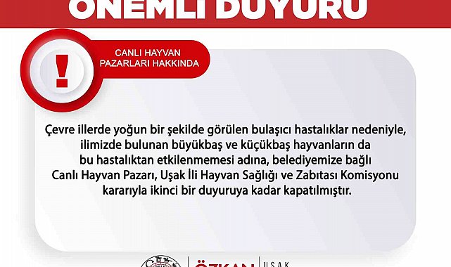 Uşak Belediyesi'nin sosyal medya hesabından yapmış olduğu duyuruda çevre illerde görülen bulaşıcı hastalık nedeniyle Canlı Hayvan Pazarı, Uşak İli Hayvan Sağlığı ve Zabıtası Komisyonu kararıyla ikinci bir duyuruya kadar kapandığını duyurdu.