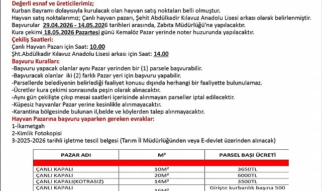 Öte yandan kura çekiminin ardından ücretler peşin olarak tahsil edilecek. Çekilişte hak kazanıp mesai saatleri içerisinde alınmayan parseller ise doğrudan iptal edilecek. Küpesiz hayvanlar pazar yerine alınmayacak, karantina bölgelerinden ise başvuru kabul edilmeyecek.