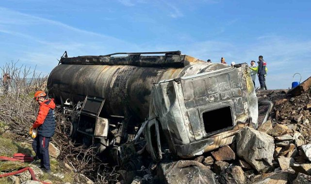 Uşak'ta şarampole devrilen mazot yüklü akaryakıt tankerinde çıkan yangında sürücü hayatını kaybetti.