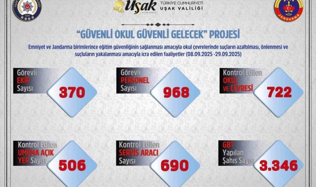 Edinilen bilgiye göre, 8 Eylül ile 29 Eylül tarihleri arasında polis ve jandarma tarafından okul çevreleri ile okul servislerinde denetim yapıldı. Uşak İl Emniyet Müdürlüğü ve İl Jandarma Komutanlığı bağlı toplam 370 ekip ve 968 personel ile 722 okul çevresi, 506 umuma açık yer, 690 okul servis aracı denetlendi. Okul çevresi ve umuma açık yerlerde bulunan toplam 3 bin 346 kişi sorgulandı.