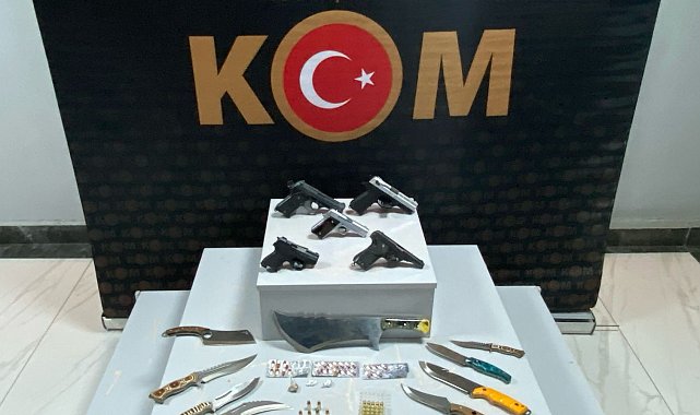 Uşak İl Emniyet Müdürlüğü'ne bağlı Kaçakçılık ve Organize Suçlarla Mücadele Şube Müdürlüğü ekipleri, edinilen bilgiler çerçevesinde Durak Mahallesi'nde bulunan bir iş yerine operasyon düzenledi. İş yeri içeresinde yapılan aramalarda 8 adet ruhsatsız tabanca, 1 adet ruhsatsız tüfek, 9 adet bıçak, 38 adet tabancaya ait fişek, 30 adet sentetik ecza, bir miktar kokain ve esrar ele geçirildi.