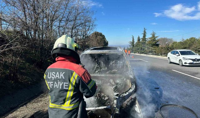 Uşak'ta seyir halindeyken arızalanan cip, emniyet şeridine çekildikten sonra çıkan yangında tamamen yanarak kullanılamaz hale geldi.