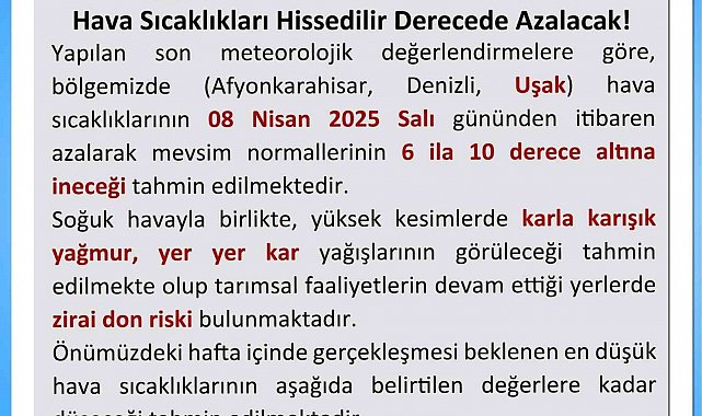 Uşak Valiliği sosyal medya üzerinden yapılan paylaşımda hava sıcaklıkların mevsim normallerin altına düşeceğini ve soğuk havayla birlikte tarımsal faaliyetlerin devam ettiği yerlerde zirai don riskine karşı vatandaşları uyararak; "Hava Sıcaklıkları Hissedilir Derecede Azalacak! Yapılan son meteorolojik değerlendirmelere göre, bölgemizde (Afyonkarahisar, Denizli, Uşak) hava sıcaklıklarının 08 Nisan 2025 Salı gününden itibaren azalarak mevsim normallerinin 6 ila 10 derece altına ineceği tahmin edilmektedir. Soğuk havayla birlikte, yüksek kesimlerde karla karışık yağmur, yer yer kar yağışlarının görüleceği tahmin edilmekte olup tarımsal faaliyetlerin devam ettiği yerlerde zirai don riski bulunmaktadır. Önümüzdeki hafta içinde gerçekleşmesi beklenen en düşük hava sıcaklıklarının aşağıda belirtilen değerlere kadar düşeceği tahmin edilmektedir." ifadeleri kullanıldı.