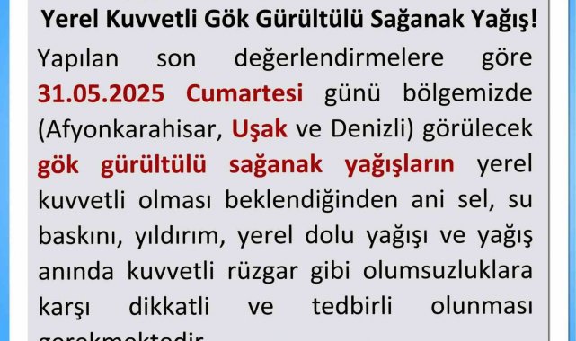 Uşak Valiliğince yayımlanan açıklamada ise; "Yapılan son değerlendirmelere göre 31.05.2025 Cumartesi günü bölgemizde (Afyonkarahisar, Uşak ve Denizli) görülecek gök gürültülü sağanak yağışların yerel kuvvetli olması beklendiğinden ani sel, su baskını, yıldırım, yerel dolu yağışı ve yağış anında kuvvetli rüzgar gibi olumsuzluklara dikkatli ve tedbirli olunması gereklidir." ifadeleri kullanıldı.