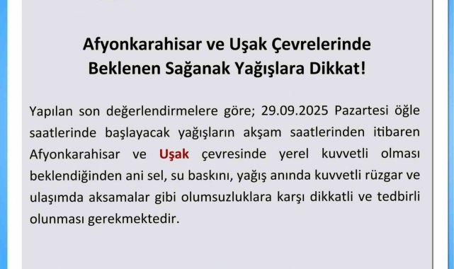 Uyarıda, 29 Eylül öğle saatlerinde başlaması beklenen yağışların akşam saatlerinden itibaren etkisini artıracağı belirtilerek, "Afyonkarahisar ve Uşak çevresinde yerel kuvvetli olması beklendiğinden ani sel, su baskını, yağış anında kuvvetli rüzgar ve ulaşımda aksamalar gibi olumsuzluklara karşı dikkatli ve tedbirli olunması gerekmektedir" ifadelerine yer verildi.