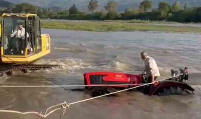 Uyarılara aldırış etmedi, traktörüyle akarsuda mahsur kaldı