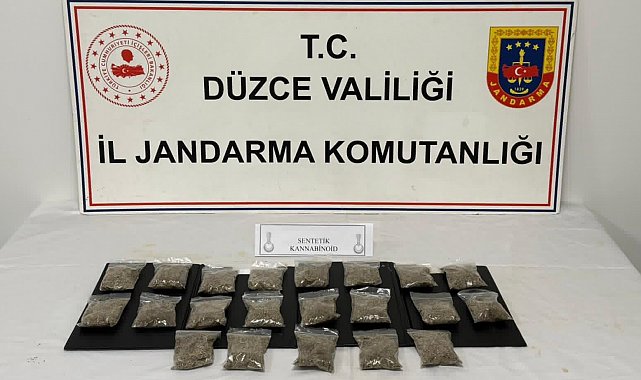 Düzce Cumhuriyet Başsavcılığı koordinesinde İl Jandadma Komutanlığı Narkotik Suçlarla Mücadele Şube Müdürlüğü ekiplerince yürütülen çalışmalarda merkez ilçede H.T isimli şahsın il dışından getirdiği uyuşturucu maddelerin ticaretini yaptığı tespit edildi. Jandarma ekiplerinin yaptığı baskında H.T isimli şahıs uyuşturucu maddeleri satışa hazırlarken yakalandı. Şahsın evinde yapılan aramada 21 adet 50'şer gramlık paketler halinde, toplam 1 kilo 50 gram uyuşturucu madde emdirilmiş sentetik kannabinoid ele geçirildi. H.T isimii şahıs göz altına alınırken hakkında adli işlem başlatıldı.