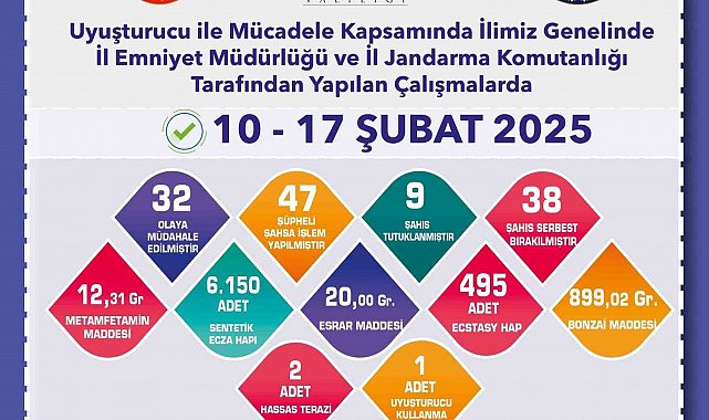 Edinilen bilgilere göre, İl Emniyet Müdürlüğü ve İl Jandarma Komutanlığı tarafından 10-17 Şubat 2025 tarihleri arasında uyuşturucu ile mücadele çerçevesinde çalışma yapıldı. Ekiplerin 32 olaya müdahale ettiği çalışmalarda 47 şüpheli şahsa işlem uygulanırken, 9 şahıs tutuklandı ve 38 şahıs serbest bırakıldı. Yapılan aramalarda ise; 12,31 gram metamfetamin maddesi, 6 bin 150 adet sentetik ecza hapı, 20 gram esrar maddesi, 495 adet ecstasy hap, 899,02 gram bonzai maddesi, 2 adet hassas terazi ve 1 adet uyuşturucu kullanma aparatı ele geçirildi.