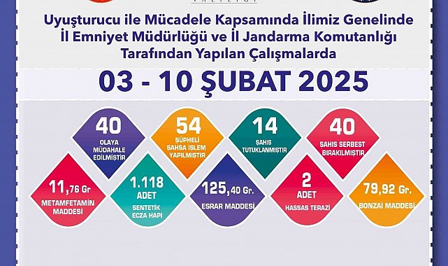Edinilen bilgilere göre, Eskişehir İl Emniyet Müdürlüğü ve İl Jandarma Komutanlığı ekipleri tarafından uyuşturucu ile mücadele çerçevesinde çalışma yapıldı. Kent genelinde 3-10 Şubat 2025 tarihleri arasında gerçekleştirilen çalışmalarda; 40 olaya müdahale edilirken, 54 şüpheliye işlem yapılıp, 14 şahıs tutuklandı ve 40 şahıs serbest bırakıldı. Ayrıca, 11,76 gr metamfetamin maddesi, bin 118 adet sentetik ecza hapı, 125,40 gr esrar maddesi, 2 adet hassas terazi ve 79,92 gr bonzai maddesinin ele geçirildiği öğrenildi.