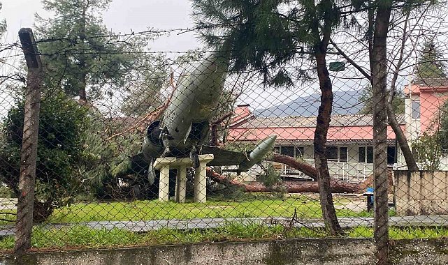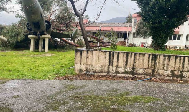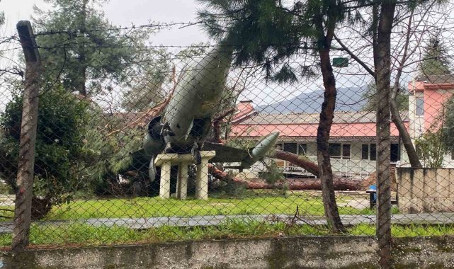 Denizli'de fırtınanın devirdiği çam ağacı, Uçaklı Okulun simgesi uçağın üzerine düştü. Kaidesinden kayan uçak zarar görürken, ortaya çıkan görüntü rüzgarın şiddetini gözler önüne serdi.