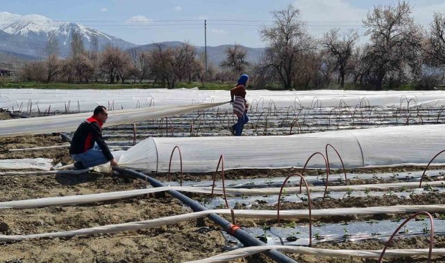 Üzümlü'de üretim yapan çiftçi Talip Akyüz, 25 dekarlık alanda yaklaşık 100 bin salçalık biber fidesini toprakla buluşturdu. Alçak tünel yöntemiyle gerçekleştirilen üretimle yaklaşık 20 gün erkencilik sağlanması hedefleniyor.
