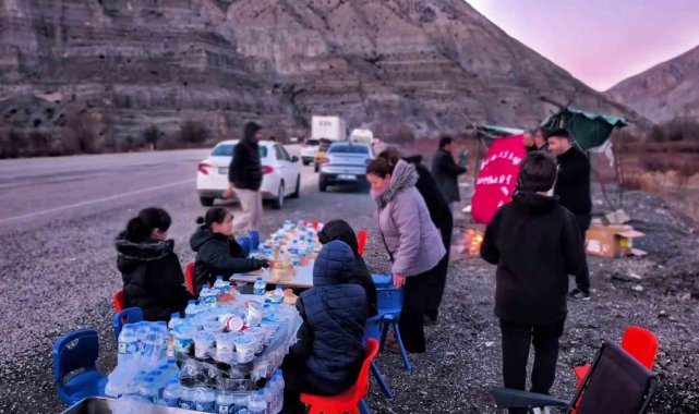 Erzurum-Artvin kara yolunda kurulan iftar sofrasında öğrenciler ve öğretmenler, evine yetişemeyen sürücülere sandviç, su ve ayran ikram ederek Ramazan'ın paylaşma ruhunu yaşattı.