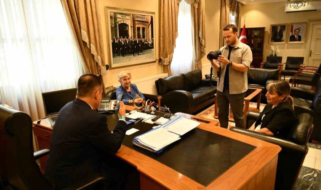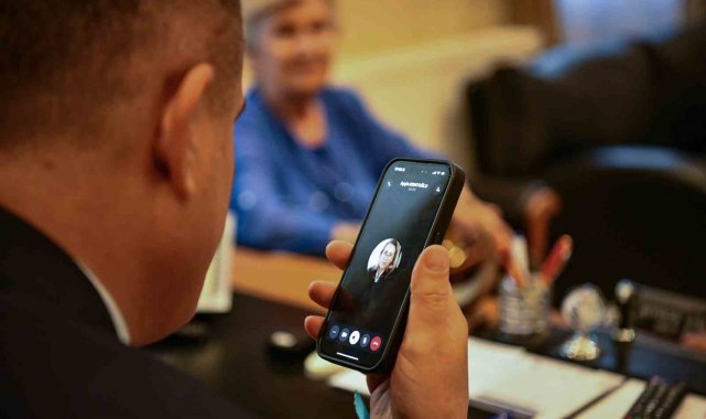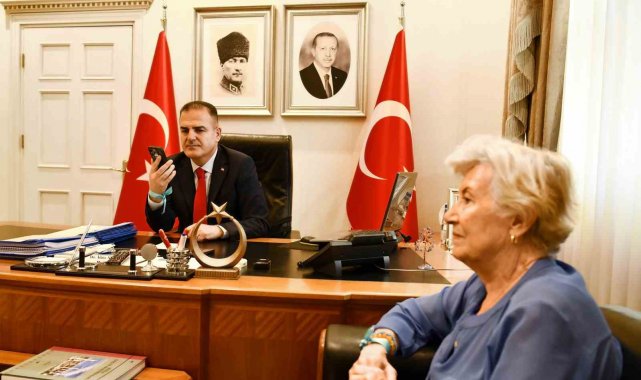 Gülser Özesen, Vali Dr. İdris Akbıyık'ın bileğine, Küresel Sumud Filosu'na desteğin sembolü olan 'Turkuaz Kurdele'yi taktıktan sonra makamdan Ayçin Kantoğlu'nu cep telefonu ile görüntülü arayarak başarılar diledi.