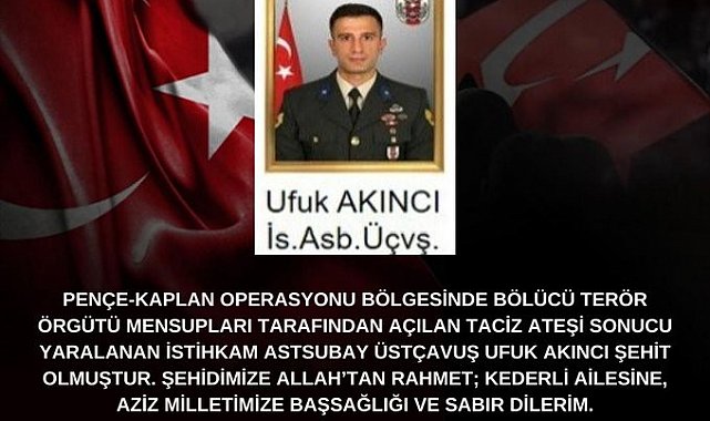 "Pençe-Kaplan Operasyonu bölgesinde bölücü terör örgütü mensupları tarafından açılan taciz ateşi sonucu yaralanan İstihkam Astsubay Üstçavuş Ufuk Akıncı şehit olmuştur. Şehidimize Allah'tan rahmet; kederli ailesine, aziz milletimize başsağlığı ve sabır dilerim."