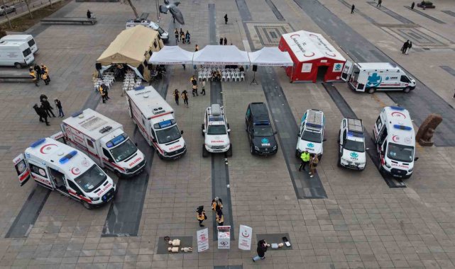 Çorum'da Acil Sağlık Hizmetleri Haftası dolayısıyla Kadeş Barış Meydanı'nda farkındalık etkinliği düzenlendi. Acil sağlık hizmetlerinin önemine dikkat çekmek amacıyla gerçekleştirilen programa protokol üyeleri ve vatandaşlar yoğun ilgi gösterdi. Etkinlik kapsamında, ani kalp durmalarında hayat kurtarıcı rol oynayan Otomatik Eksternal Defibrilatör (OED) cihazı hakkında bilgilendirme yapıldı. Sağlık ekipleri, cihazın nasıl kullanılacağını uygulamalı olarak gösterirken, OED'nin toplumda yaygınlaştırılmasına yönelik yürütülecek çalışmalar hakkında da sunum yapıldı. Programda İl Sağlık Müdürlüğü bünyesinde zorlu coğrafi şartlarda ve afet durumlarında kullanılan özel donanımlı ambulanslar ve sağlık araçları sergilendi. Protokol üyeleri ve katılımcılar araçları yakından inceleyerek, 112 personelinden araçların teknik özellikleri ve kullanım alanları hakkında bilgi aldı.