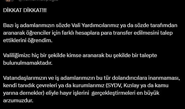 Vali Hatipoğlu sosyal medya hesabından yaptığı açıklamada, "Bazı iş adamlarımızın sözde vali yardımcılarımız ya da sözde tarafımdan aranarak öğrenciler için farklı hesaplara para transfer edilmesini talep ettiklerini öğrendim. Valiliğimiz hiç bir şekilde kimseyi aranarak bu şekilde bir talepte bulunulmamaktadır. Vatandaşlarımızın ve iş adamlarımızın bu tür dolandırıcılara inanmaması, kendi tanıdık çevreleri ya da kurumlarımız SYDV, Kızılay ya da kamu yarına dernekler eliyle hayır işlerini gerçekleştirmeleri en büyük arzumuzdur" ifadelerine yer verdi.