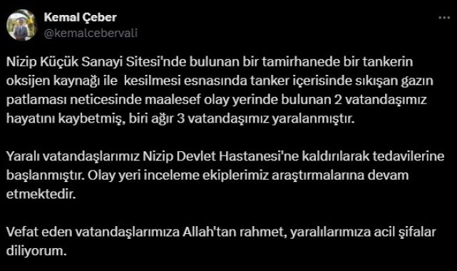 Olayla ilgili sosyal medya hesabından açıklama yapan Gaziantep Valisi Kemal Çeber, "Nizip Küçük Sanayi Sitesi'nde bulunan bir tamirhanede bir tankerin oksijen kaynağı ile kesilmesi esnasında tanker içerisinde sıkışan gazın patlaması neticesinde maalesef olay yerinde bulunan 2 vatandaşımız hayatını kaybetmiş, biri ağır 3 vatandaşımız yaralanmıştır. Yaralı vatandaşlarımız Nizip Devlet Hastanesi'ne kaldırılarak tedavilerine başlanmıştır. Olay yeri inceleme ekiplerimiz araştırmalarına devam etmektedir. Vefat eden vatandaşlarımıza Allah'tan rahmet, yaralılarımıza acil şifalar diliyorum" ifadelerine yer verdi.