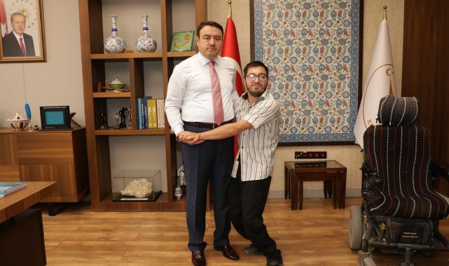 Kütahya Valisi Musa Işın, engelli vatandaş Sefa Yiğit'i makamında kabul etti.