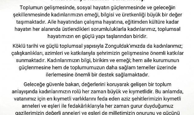 Zonguldak özelinde kadınların azim ve çalışkanlığına değinen Vali Hacıbektaşoğlu, "Köklü tarihi ve güçlü toplumsal yapısıyla Zonguldak'ımızda da kadınlarımız; çalışkanlıkları, azimleri ve katkılarıyla şehrimizin gelişmesine önemli katkılar sunmaktadır. Kadınlarımızın bilgi, birikim ve emeği; hem aile kurumunun güçlenmesine hem de toplumumuzun daha sağlam temeller üzerinde ilerlemesine önemli bir destek sağlamaktadır" dedi.
