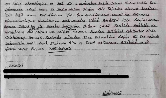 M.M.Y. isimli hükümlü, cezaevinden Vali Şıldak'a yazdığı mektupta, boşanma sürecinde olduğunu ve çocuklarının kendi anne ve babasıyla birlikte yaşadıklarını belirtti. Çocuklarının doğum günlerinin yaklaştığını ifade eden M.M.Y., oğulları Ali Miran ve Miraç Eymen'in bisiklet ve Galatasaray forması hayali kurduklarını aktardı. Maddi imkansızlıklar nedeniyle çocuklarının bu isteklerini karşılayamadığını söyleyen baba, mektubunda şu ifadelere yer verdi: "Bu mektubu kendim için değil, çocuklarım için yazıyorum. Eşimle boşanma aşamasında olduğum için çocuklarım şu an annem ve babamla birlikte kalıyorlar. Doğum günleri yaklaşan Ali Miran ve Miraç Eymen, benden bisiklet ve Galatasaray forması istediler. Ancak içinde bulunduğum şartlar nedeniyle bu masum isteklerini karşılayamıyorum. Sizden ricam, onların bu küçük dileklerini yerine getirmenizdir."