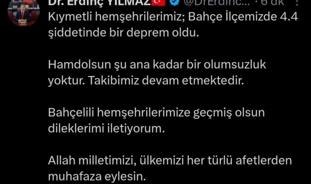 AFAD tarafından yapılan açıklamaya göre, saat 12.09'da merkez üssü Bahçe ilçesi olan 4.4 büyüklüğünde bir deprem meydana geldi. 8.8 kilometre derinlikte gerçekleşen deprem kent genelinde kısa süreli paniğe neden olurken, herhangi bir olumsuzluk yaşanmadığı öğrenildi. Osmaniye Valisi Erdinç Yılmaz, yaptığı açıklamada deprem sonrası tüm birimlerin sahada teyakkuz halinde olduğunu belirterek, "Şu ana kadar bize ulaşan herhangi bir olumsuzluk bulunmuyor. Ekiplerimiz gerekli kontrolleri sürdürüyor. Vatandaşlarımıza geçmiş olsun dileklerimi iletiyorum" dedi.