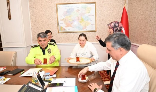Vali Mustafa Çiftçi'nin "Valiliğimizin gülleri" diye adlandırdığı down sendromlu özel çocuklar Çağla Okyay ve Elif Ademoğlu, Valilik makamında göreve başlayarak misafirlere hizmet vermeye başladı.