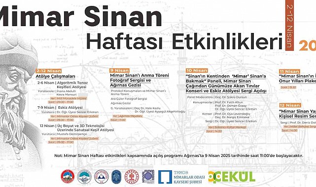 Kayseri Valiliği ve Kayseri Büyükşehir Belediyesi iş birliğinde 2-12 Nisan Mimar Sinan Haftası Etkinlikleri düzenlenecek. Sergiler, panel, gezi ve konser gibi aktivitelerin düzenleneceği Mimar Sinan Haftası Etkinlikleri'nin açılış programını 9 Nisan Çarşamba günü saat 11.00'de Ağırnas'ta gerçekleştirilecek.