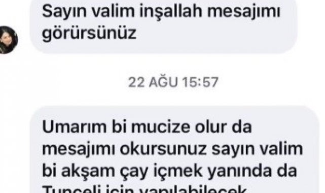 Tunceli'de yaşayan Sinem Durmaz, Tunceli Valisi Şefik Aygöl'e sosyal medya üzerinden, "Umarım mesajımı okursunuz Valim. Bir akşam çay içmek, yanında da Tunceli için yapılabilecek projeleri dinlemek istersiniz. Sizi ve güzel eşinizi çaya davet etmek istiyorum. Başımızın üstünde yeriniz var gelirseniz bizi çok mutlu edersiniz" şeklinde mesaj gönderdi. Daveti karşılıksız bırakmayan Tunceli Valisi Şefik Aygöl, eşi Nazlı Aygöl ile birlikte Durmaz ailesini ziyaret etti. Vali Aygöl'ü kapıda gören Sinem Durmaz, büyük mutluluk yaşadı. Samimi sohbet içerisinde geçen ziyaret, sosyal medyada büyük ilgi gördü.