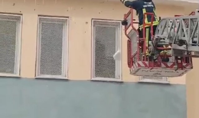 Gelen ihbar üzerine harekete geçen Van Büyükşehir Belediyesi İtfaiye Daire Başkanlığı'na bağlı İpekyolu Grup Amirliği ekipleri, ildeki okulların çatılarında biriken buz sarkıtlarını merdivenli araç yardımıyla kırarak düşürdü.