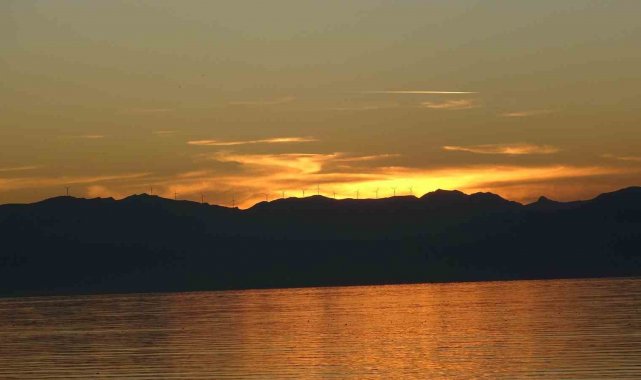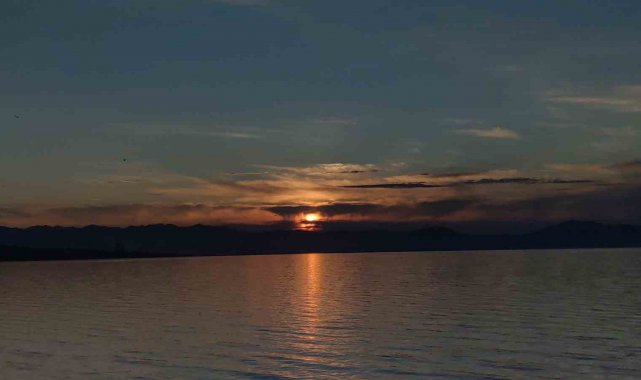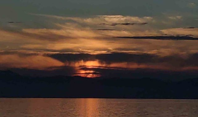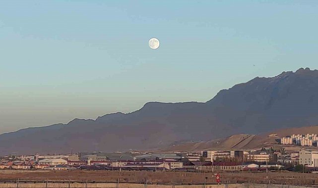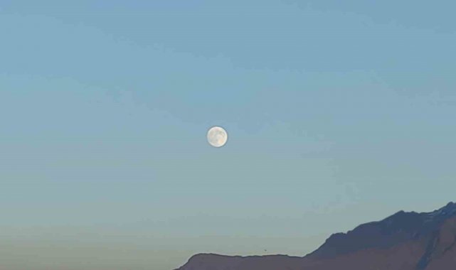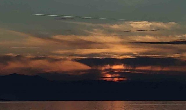 Van'da akşam saatlerinde güneş batarken, doğu ufkunda ayın yükselmesi gökyüzünde etkileyici bir manzara oluşturdu. Gün batımıyla birlikte ayın parlak yüzü aynı anda gökyüzünü süsledi.