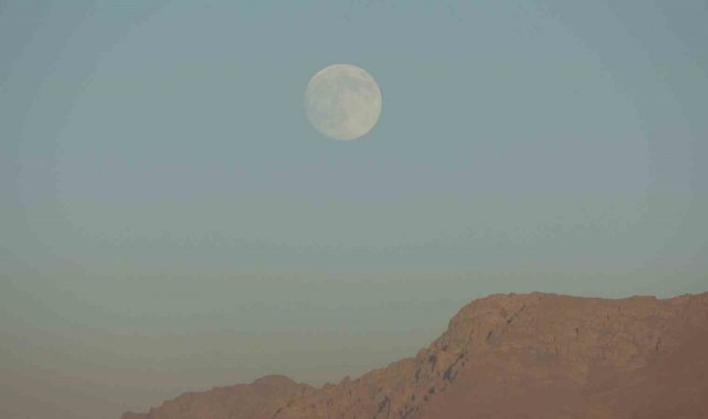 Gün batımının turuncu ve kırmızı tonları, batı ufkunu bir tablo gibi boyarken, doğu tarafından yükselen ay, gökyüzüne gümüşi ve soğuk bir ışık yaydı. Ay'ın evresinin dolunaya yakın olduğu ve atmosferin belirli bir berraklıkta olduğu zamanlarda bu denli net görülebiliyor.