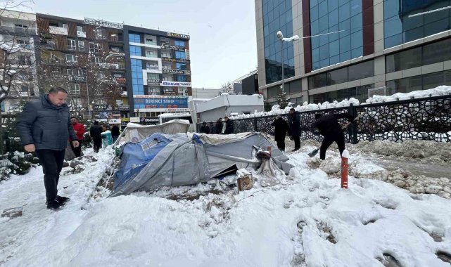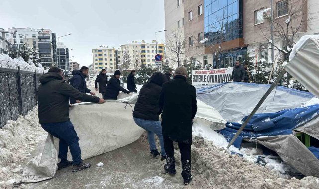 Van'da DEM Partili belediyeler tarafından işten çıkarılan işçilerin İpekyolu Belediyesi önünde kurduğu eylem çadırı yoğun kar yağışının ardından çöktü.