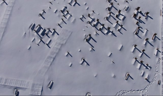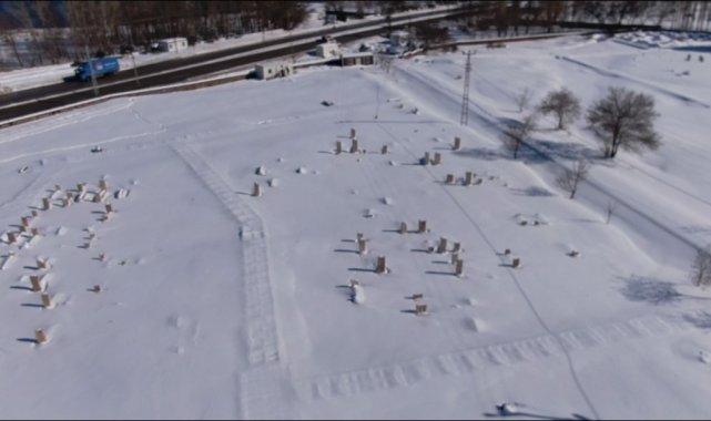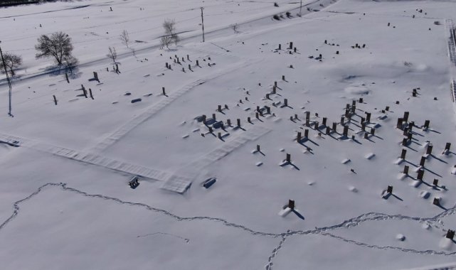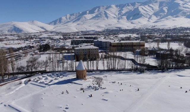 Kar yağışı sonrası Gevaş ilçesindeki Selçuklu Mezarlığı beyaza büründü. Halime Hatun Kümbeti'nin de bulunduğu yaklaşık 50 dönümlük alanda, işleme ve yazılarıyla öne çıkan mezar taşları karla kaplandı. Mezar taşları, Halime Hatun Kümbeti, Artos Dağı'nın karla kaplı manzarası ile Van Gölü'nün mavi suları havadan görüntülendi.