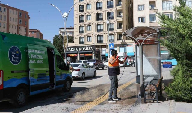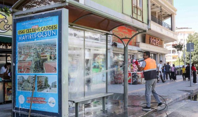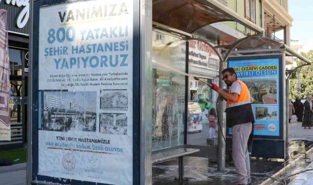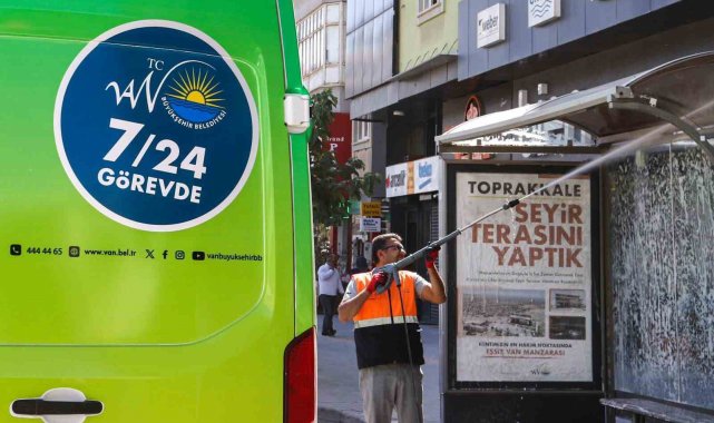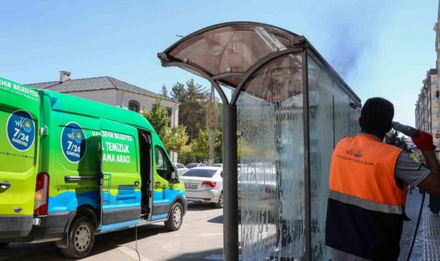 Van Büyükşehir Belediyesi bünyesinde hizmete başlayan mobil temizlik ve yıkama aracı ile kent genelindeki otobüs durakları yıkanarak hijyenik hale getiriliyor.