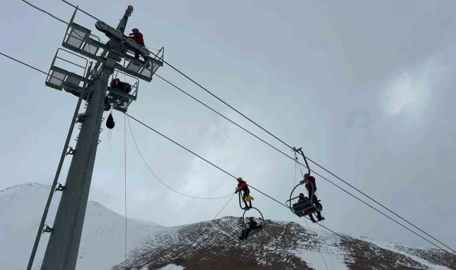 Senaryo gereği kayak merkezinde meydana gelen çığ nedeniyle elektrik kesintisi yaşanırken, telesiyejde 4 kişi mahsur kaldı. Olay yerine sevk edilen ekipler, telesiyejde mahsur kalanları güvenli şekilde tahliye ederek aşağı indirdi.