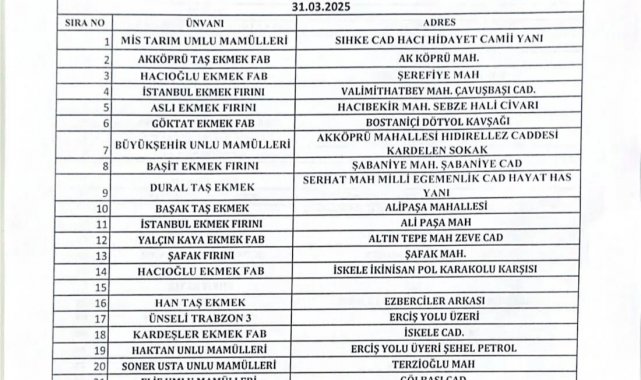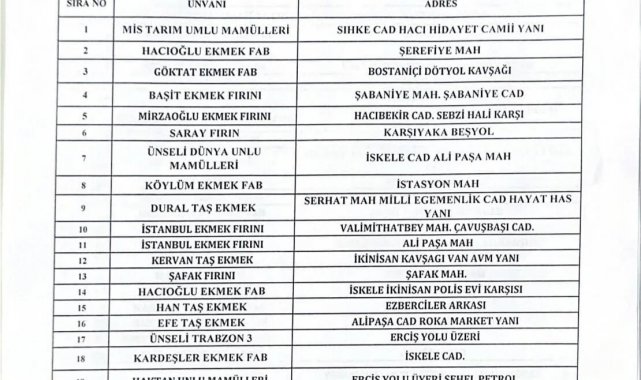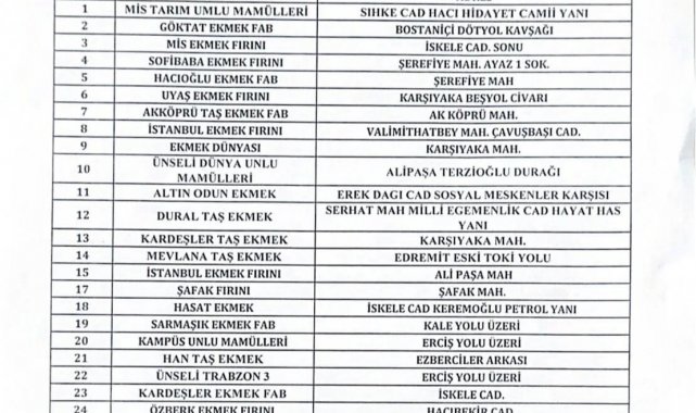 Van Lokantacılar, Fırıncılar, Pastaneciler, Tatlıcılar ve Kasaplar Esnaf Odası tarafından paylaşılan bilgilere göre, bayramın ilk üç gününde hizmet verecek ekmek fırınlarının tam listesi paylaşıldı. Paylaşılan listeye göre bayramın birinci günü; Mis Tarım Unlu Mamulleri, Hacıoğlu Ekmek Fabrikası, Göktat Ekmek Fabrikası, Başit Ekmek Fırını, Mirzaoğlu Ekmek Fırını, Saray Fırın, Ünseli Dünya Unlu Mamulleri, Köylüm Ekmek Fabrikası, Dural Taş Ekmek, İstanbul Ekmek Fırını, İstanbul Ekmek Fırını (Ali Paşa Mah.), Kervan Taş Ekmek, Şafak Fırını, Hacıoğlu Ekmek Fabrikası (İskele), Han Taş Ekmek, Efe Taş Ekmek, Ünseli Trabzon 3, Kardeşler Ekmek Fabrikası, Haktan Unlu Mamulleri, Yusuf Oğlu Ekmek Fabrikası, Soner Usta Unlu Mamulleri, Elif Unlu Mamulleri, Kiler Taş Ekmek ve Van Gölü Ekmek Fabrikası hizmet verecek.
