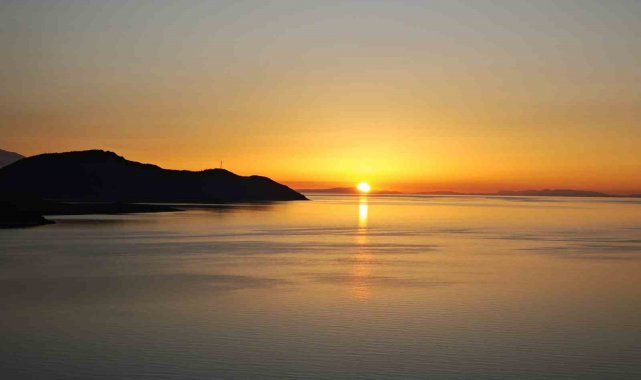 Bitlis'in Tatvan ilçesinde Van Gölü üzerinde doğan güneşin oluşturduğu görüntü hayranlık uyandırdı.