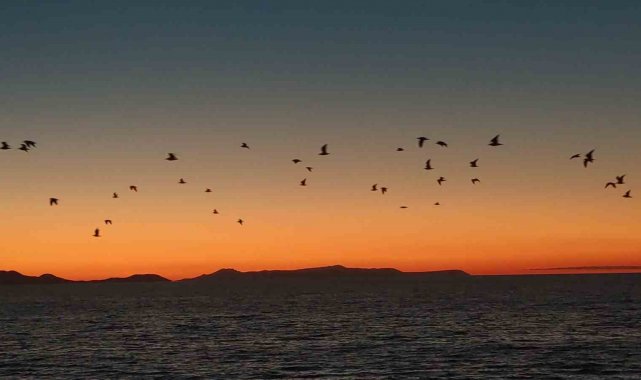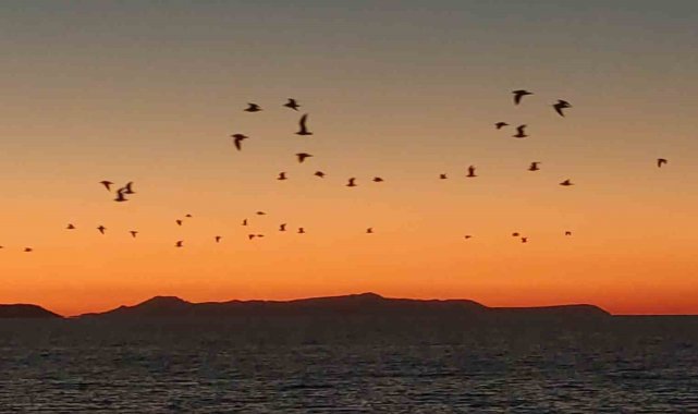 Van Gölü sahillerinde gündüz saatlerinde yiyecek arayarak karınlarını doyuran kuşlar, akşam saatlerinde farklı alanlara göç ederken kartpostallık görüntülerin ortaya çıkmasına neden oluyor.