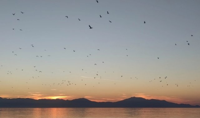 Van Gölü semalarında akşam saatlerinde etkileyici bir doğa manzarası yaşandı. Göl üzerinde toplanan kuş sürüsü, dairesel hareketlerle uzun süre havada süzülerek adeta görsel bir şölen sundu.