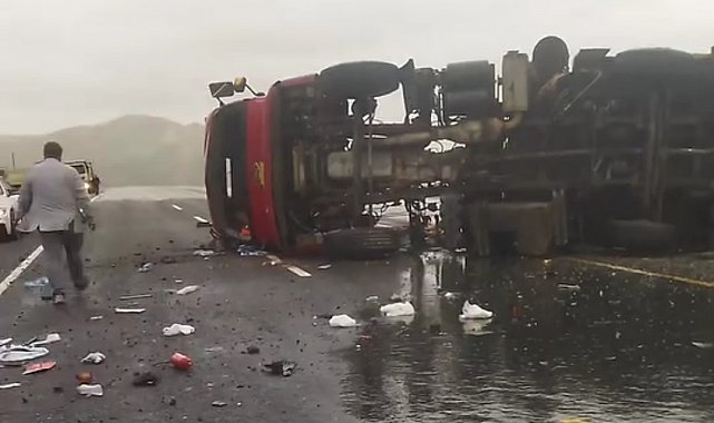 Tırın devrilmesi nedeniyle yolda kısa süreli aksama yaşanırken, ekiplerin çalışmaları sonucu trafik kontrollü olarak yeniden sağlandı.