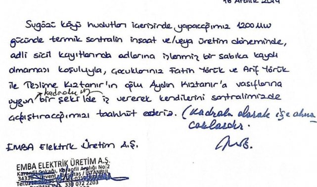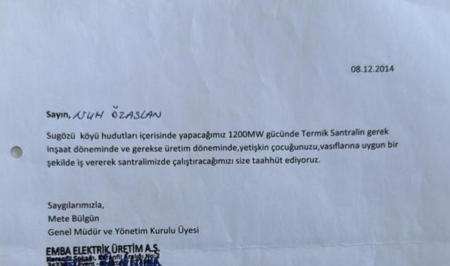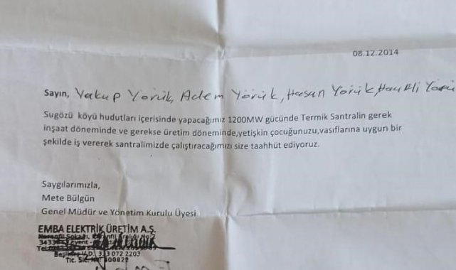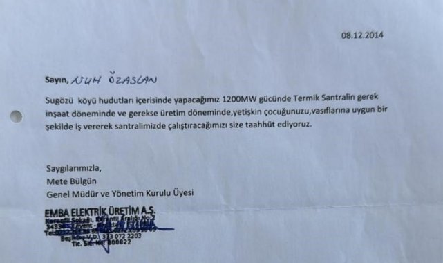 Mahalle sakinlerinin iddiasına göre, EMBA Elektrik Üretim A.Ş. yetkilileri, arazilerin satışı karşılığında vatandaşlara, "Sugözü köyü hudutları içerisinde yapacağımız 1200 MW gücünde termik santralin gerek inşaat döneminde ve gerekse üretim döneminde, yetişkin çocuğunuzu, vasıflarına uygun bir şekilde iş vererek santralimizde çalıştıracağımızı size taahhüt ediyoruz" yazılı genel müdür imzalı taahhütname imzaladı. Ancak bölge sakinleri, bu sözün tutulmadığını ileri sürdü.