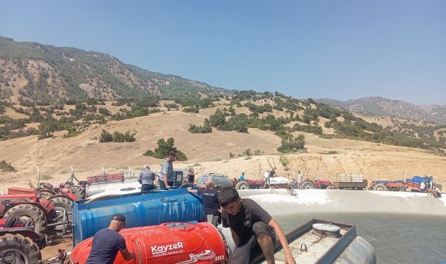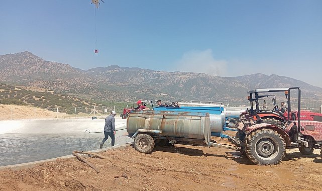 Denizli'nin Buldan ilçesinde başlayıp Aydın'ın Buharkent ilçesine yayılan orman yangınında söndürme çalışmaları aralıksız devam ederken, vatandaşlar helikopterlerin su aldığı yangın havuzuna tankerlerle su taşıdılar.