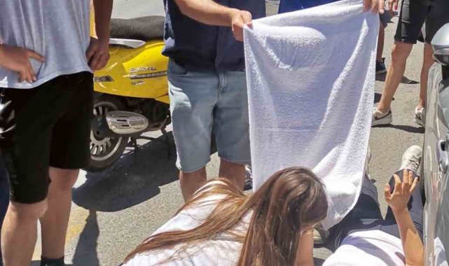 Sıcak hava nedeniyle yerde yatan kadının güneşten etkilenmemesi için vatandaşlar, üzerine havlu örterek gölgelik oluşturdu. Olay yerine sağlık ve polis ekipleri sevk edildi. İlk müdahalesi olay yerinde yapılan kadın sürücü, ambulansla hastaneye kaldırıldı.